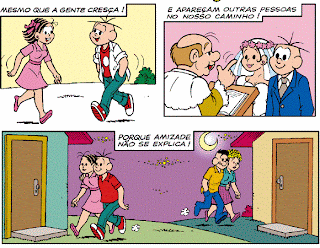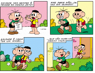 Peça para que os alunos imaginem e escrevam possíveis falas do Cascão e do Cebolinha de acordo com o que eles acham que cada um está dizendo em cada quadrinho. Neste momento é importante que os alunos já tenham a compreensão da estrutura de uma história em quadrinhos como, por exemplo, que a fala de cada um vem representada por balões e que cada tipo de balão representa o modo como os personagens estão se expressando (falando, gritando, pensando, etc.).